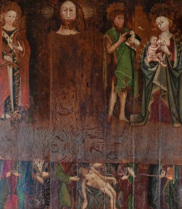 What remains shows the large head of Christ flanked by the figures of St. Catherine to the left and John the Baptist and the Virgin Mary on the right. The Virgin, unusually, is suckling her child. St John holds the Lamb of God and raises his right hand in blessing, while St Catherine clutches the wheel on which she was martyred; at her feet, impaled by her sword, lies the head of a tyrant – she was a feisty lady! The painting is unbalanced: since Christ would undoubtedly have been in the centre, there must have been a further figure on the left side, at least.