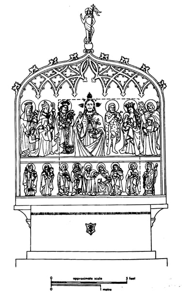 MacRoberts based his reconstruction on the description of the now lost altarpiece at Arbroath Abbey. This showed Christ as Salvator Mundi, ‘Saviour of the World’, with the orb in his hand - a motif already familiar in Fowlis Church and which, if he was seated, would fit neatly into the blank space in the middle of the painting. For the portraits of the abbey’s patron saint, Thomas a Becket, and founder, King William the Lion, MacRoberts substituted St. Marnock and Andrew Lord Gray and his wife. He postulates that those of the founding couple, being family, may well have been removed for safe keeping. Ironically these are now lost.