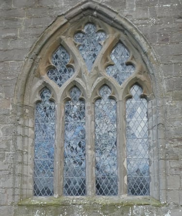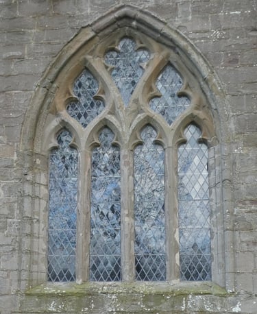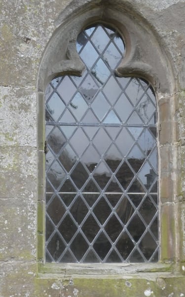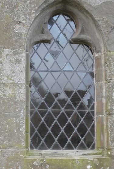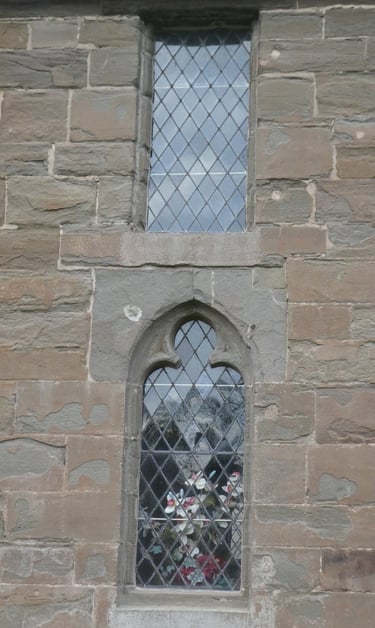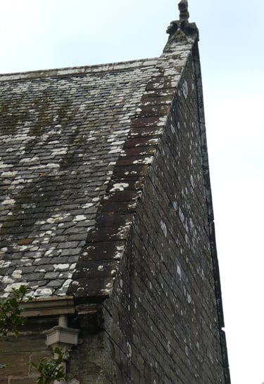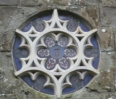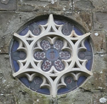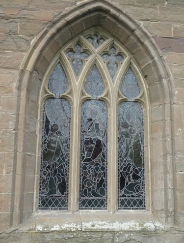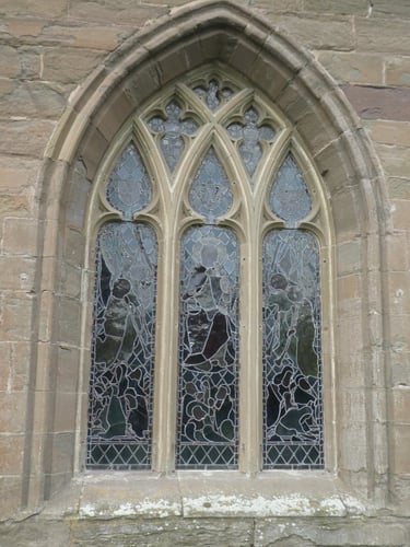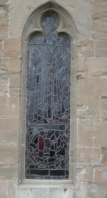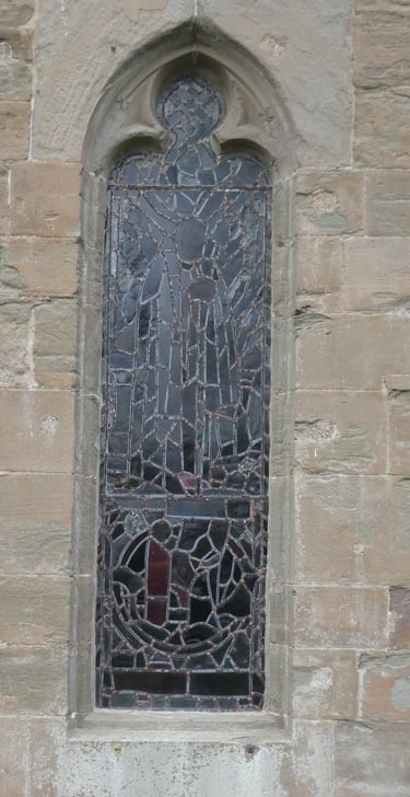 The great Gothic arched window in the west gable was designed to cast light into the nave, while its smaller equivalent near the south-east corner was so placed to illuminate the altar. The latter is a memorial window to the Grays. The round ‘ocular’ window in the east gable has been restored but retains the original form of its tracery. Its exact ‘twin’ can be seen in the tower of Melrose Abbey - not the only connection with this great Border landmark.