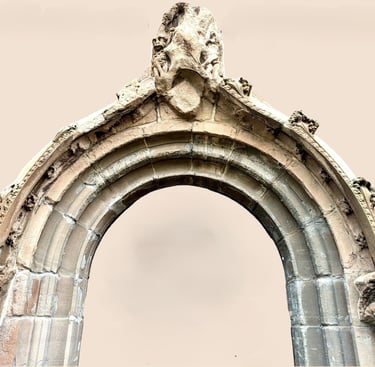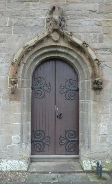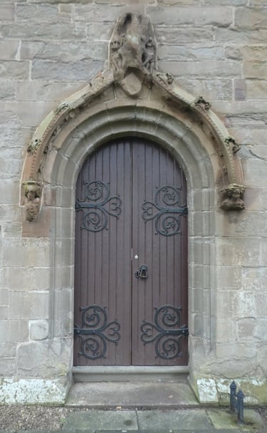 The south-east doorway was the priest’s entrance, leading directly into the chancel. The main (south-west) door has a beautifully carved, ogee-shaped canopy which is capped by an elaborate coat of arms. The diagonal shield, now eroded, presumably held the arms of Gray; above this is a helmet with lion supporters and a swan above, whose curving neck, folded wings and feathered breast can still be made out. The base of the arch is supported by angels, the right hand one wearing a pearl necklace, a symbol of purity. The arch itself is deeply and exquisitely carved with naturalistic foliage (known as ‘colewort’ from its resemblance to curly kale) and with a repeated, more geometric, floral design. In all this there is another strong echo of the great abbey at Melrose.