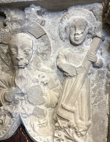 Set above the sacrament house (though this may not be its original position) is a beautifully carved Annunciation scene. The angel Gabriel on the left, with a great feathered wing, appears to Mary to announce that she has been chosen to bear the Son of God. Mary - her purity symbolised by the vase of lilies - turns tremulously towards her heavenly visitor. Her cherished Bible, which she has been reading, lies open on a delicately-fringed cushion. Gabriel's momentous words (like those of the centurion in the Crucifixion painting) are conveyed in the form of a speech scroll. But as it stands, the angel's scroll is blank. Could the message have been painted on? And if so, does this suggest that the whole scene may have been embellished with colour, bringing a further touch of sumptuousness to the rich ambiance of the chancel?